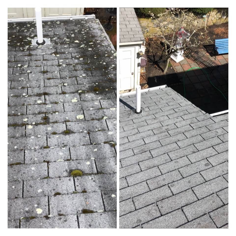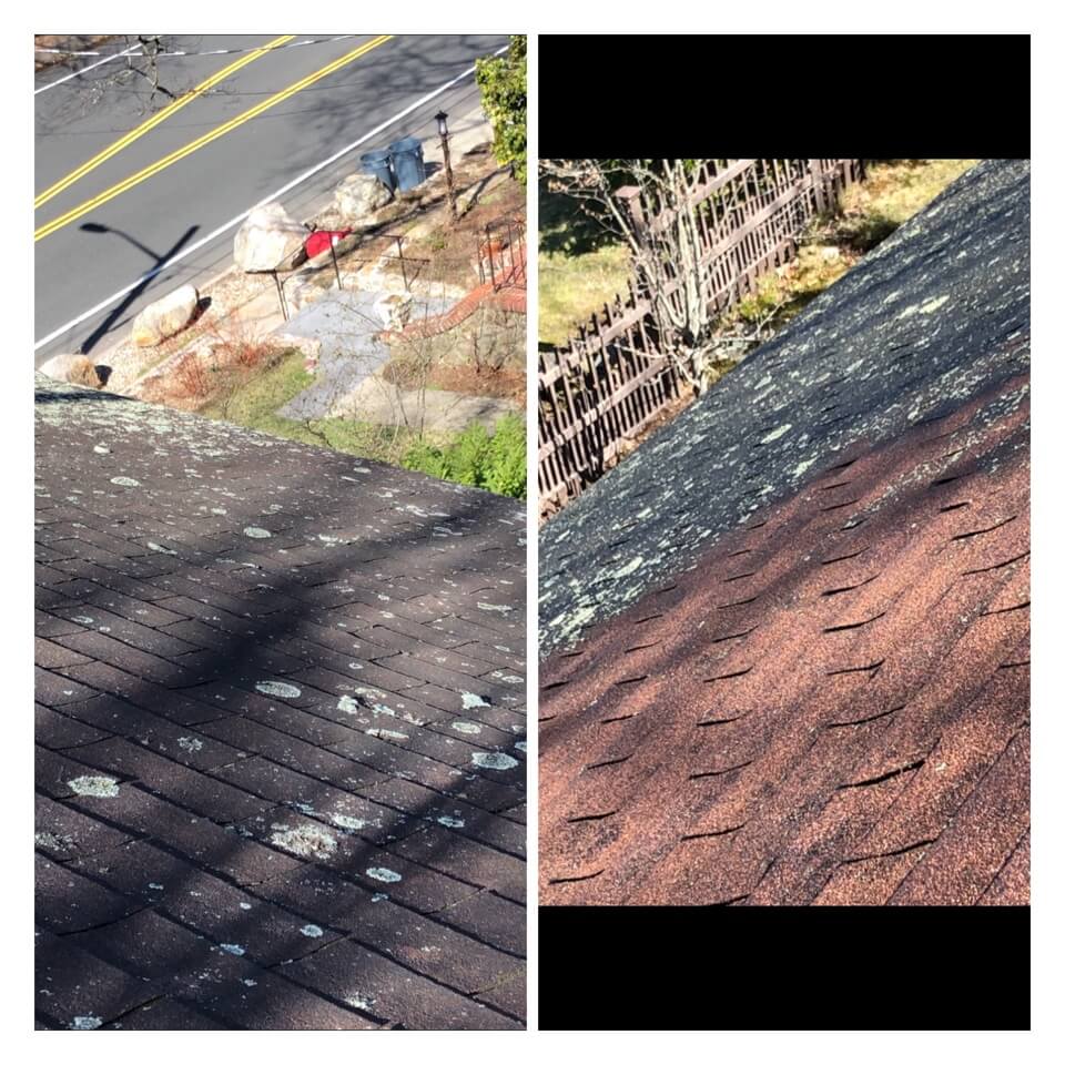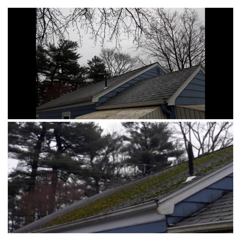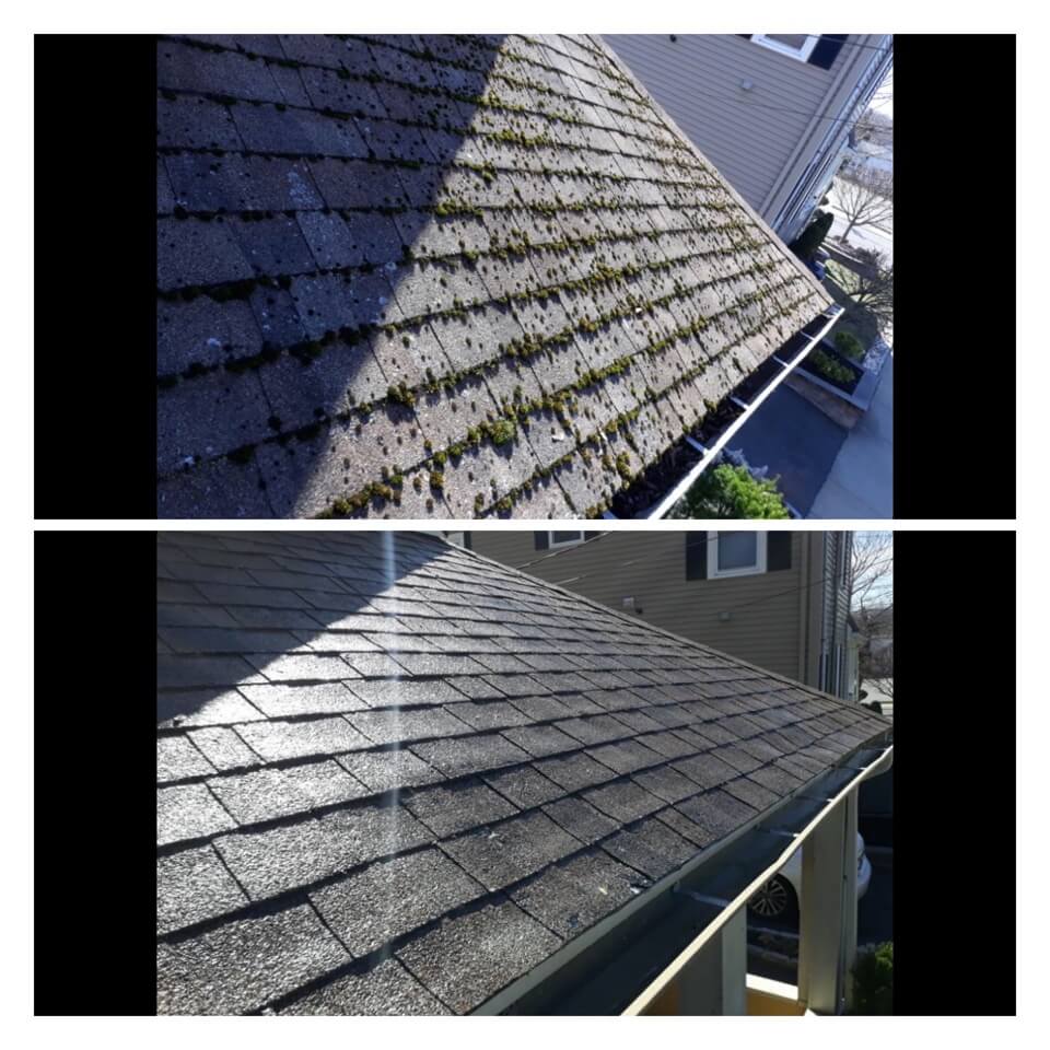 HiCleaners is the most experienced company in Brookline, MA that deals with roof washing and roof soft washing. All of our employees are trained to recognize precise solution mixing ratios to provide you with the safest and most effective soft washing service. Roofs are a commonly neglected part of a house due to the fact that most people don’t have ladders to access it, so it is very easy to just leave it alone and forget about problems that may start to arise. Just like many home owners, discoloration and small bits of moss on a roof can be overlooked because of the misconception that it is just aesthetic. However, it isn’t just aesthetic, the moss slowly lifts the granules off the shingles which in turn shorten the life of the shingle. The moss also spreads, just like any bacteria if it is left alone for too long, it can quickly become a problem that spirals out of control. Call HiCleaners for a free quote, we only use the most advanced eco-friendly solutions and equipment to make sure the job is done right, for the safety of the employees, your plants, grass, pets, and children.